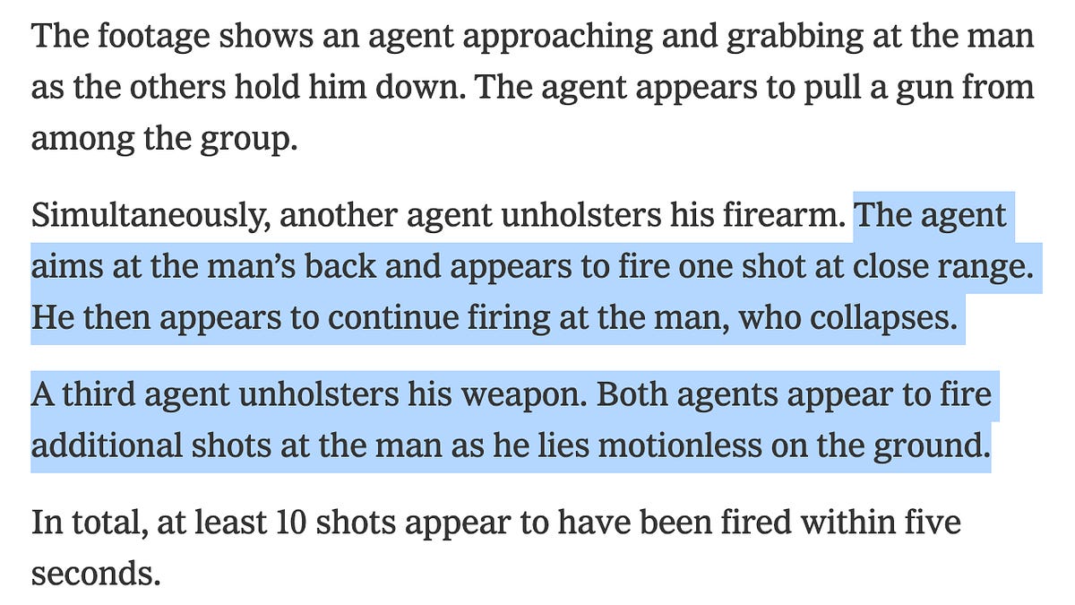 This morning, on a street in Minneapolis, at least seven federal agents tackled and then shot and killed Alex Jeffrey Pretti, a 37-year-old ICU nurse for the local VA hospital.